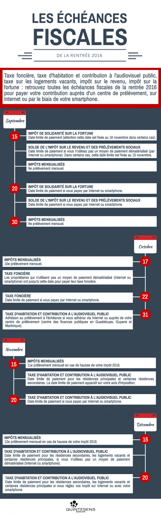 Impôt sur le revenu, taxe foncière, taxe d’habitation et contribution à l’audiovisuel public, impôt de solidarité sur la fortune : retrouvez toutes les échéances fiscales de la rentrée 2016 pour vous acquitter de vos impôts, avec Groupe Quintesens.