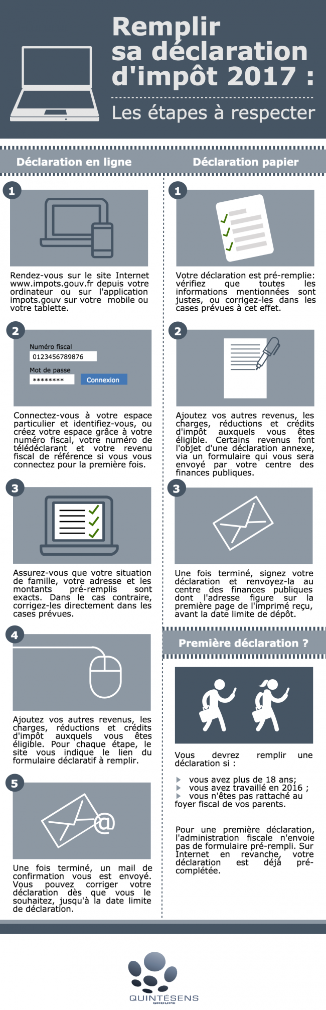 Le service de télédéclaration des revenus de 2016 est ouvert depuis mercredi 12 avril 2017. Retrouvez comment remplir votre déclaration d’impôt 2017, étape par étape, sur Internet, ou par courrier postal, en version papier, avec Quintesens.