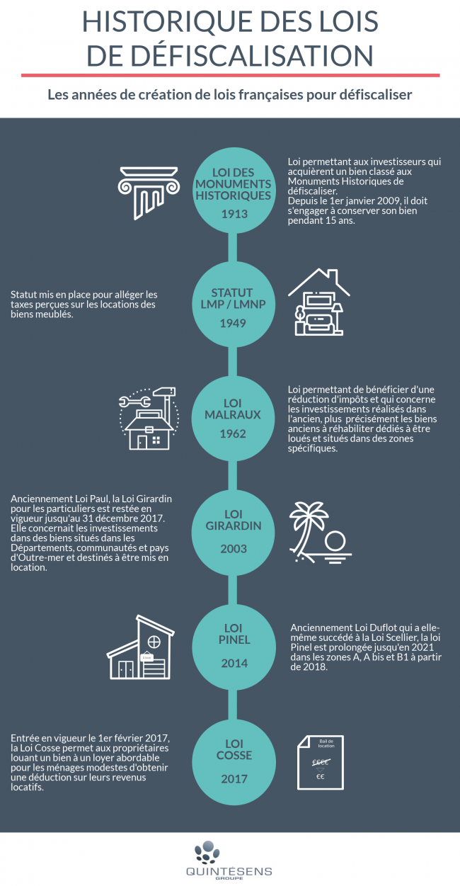 L’État français a mis en place depuis plusieurs dizaines d’années différentes lois de défiscalisation. La mise en place des dispositifs de défiscalisation immobilière varie en fonction des gouvernements. Quintésens vous présente une petite chronologie imagée de l’historique des lois de défiscalisation immobilière.