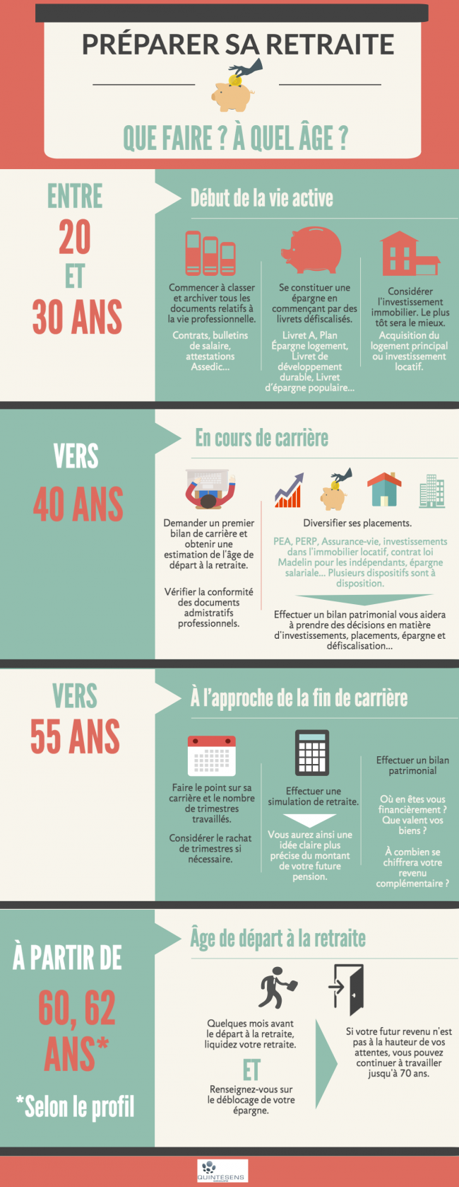 L’âge moyen de départ à la retraite se situe un peu au-delà de 60 ans. Cette échéance peut paraître lointaine mais il est important d’y penser dès le début de sa vie active. En effet l’évolution des régimes de retraite est incertaine et il convient d’anticiper la baisse de revenus qu’occasionnera la fin de carrière professionnelle. Comment préparer sa retraite tout au long de sa vie ? Quelles sont les périodes charnières ?