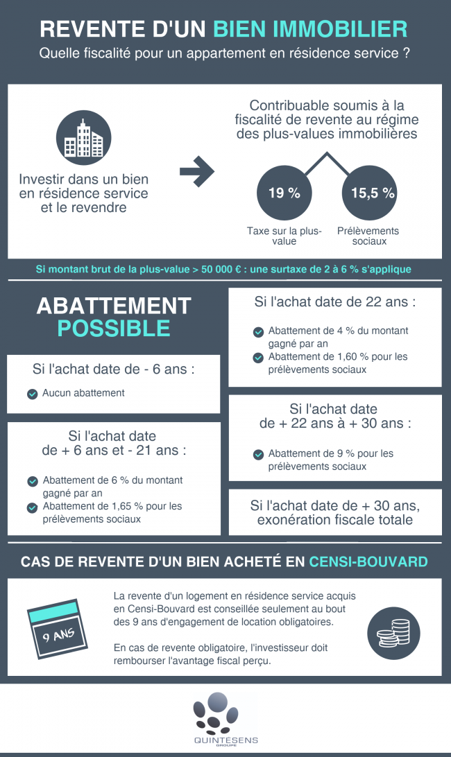 Si un investisseur souhaite revendre son bien acheté en résidence service, il est soumis au régime des plus-values immobilières. Ce régime fiscal se compose :